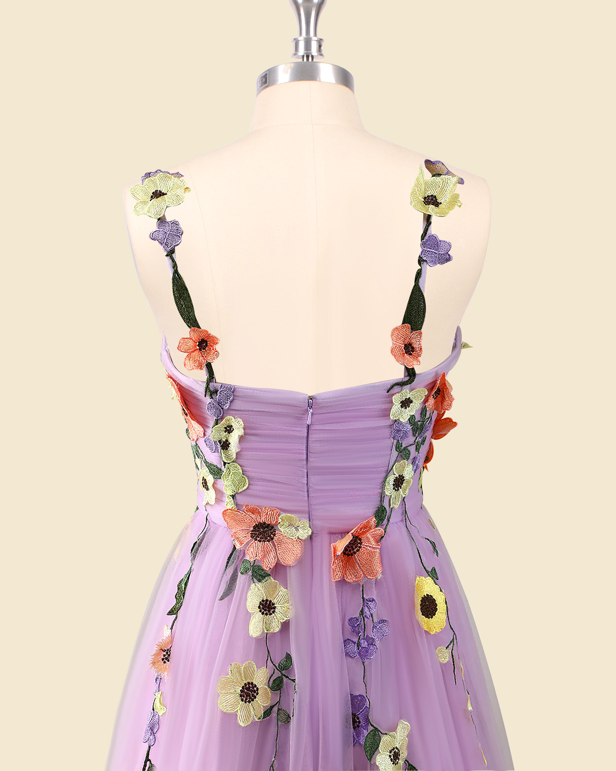 Custom floral embroidery sequin long prom dress, light purple sparkly corset evening gown