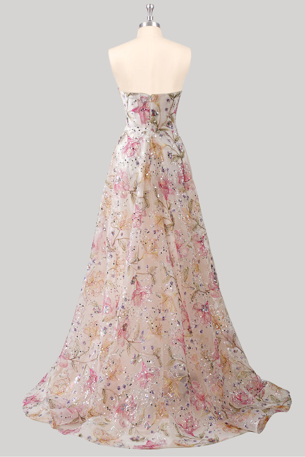 Custom sparkly light pink fairy corset long prom dress, strapless sequin embroidery party dress